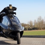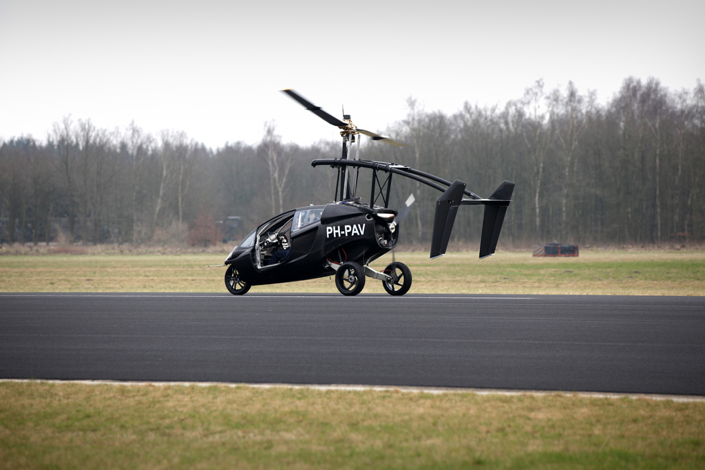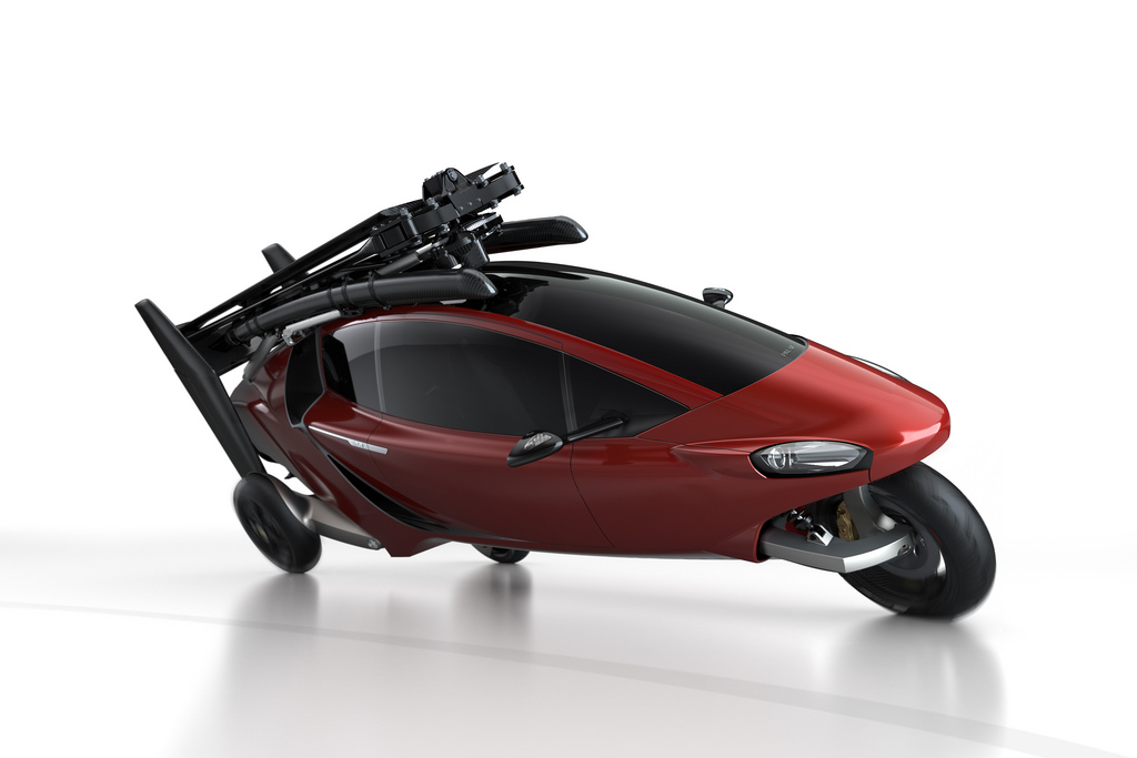 On the ground, the propeller and rotor are stopped and power is diverted to the wheels, allowing it to travel as a three-wheeled car. Unusually, it leans into turns like a motorcycle, a solution pioneered by the Carver vehicle, also produced by a Dutch company.