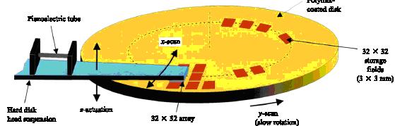 For example, a (32×32) cantilever array with 1024 storage fields, each having an area of 100×100 m2, has a capacity of about 6 G bit on a chip area on the order of 3×3 mm2. More recently single-cantilever areal densities up to 1 Tbit/in2 have been demonstrated, although currently at a somewhat degraded write/read quality.
