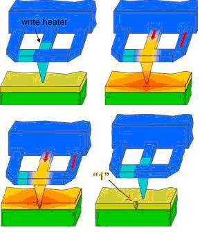 As explained earlier, information is stored in the form of 1’s and 0’s by making indentations and no indentations in the storage medium. This is achieved by a process called thermo mechanical writing which involves both mechanical and heating operations. In this process, the probe tip is heated using local heaters which soften the storage surface making it ready for writing. The heating makes it easier to penetrate the surface. Initially, the heating from the tip to the storage medium is through air which inhibits the heat transfer, but this improves as the contact area increases when the tip moves into the surface. This means that the tip must be heated to a relatively high temperature of about 400ºC to initiate the softening. Simultaneously, an electric pulse is sent to the cantilever which bends due to the atomic attraction between atoms on the medium surface and on the tip.