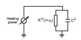In this section, we consider the read back channel for a single cantilever, scanning a storage field where bits are written as indentations or no indentations. The circuit diagram used as read channel model, which we consider for the analysis of the detection system, is illustrated in Fig1. As discussed earlier, a cantilever can be considered as a variable resistance that depends on the temperature at the cantilever tip. To evaluate the evolution of the temperature of a heated cantilever during the read process, we use a simple RC-equivalent thermal circuit, as illustrated in Fig 2 where denote the thermal resistance and capacitance, respectively. The parameter indicates the relative variation of thermal resistance resulting from the small change in the air gap width between the cantilever tip and the storage medium when an indentation is present, as compared to the case with no indentations. Here subscript x indicates the x-distance in the direction of scanning from the initial point. Therefore, the parameter x will assume the largest absolute value when the tip of the cantilever is located at the center of an indentation. The heating power that is dissipated in the cantilever heater region is expressed as