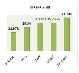Experimental results have been done in MATLAB 2014a version with 4GB RAM for high speed CPU performance and tested several satellite images taken from various satellite databases. Fig6 shows that the original LR image which has been taken for testing with proposed and existing RE methods and the decomposed LR image using DWT. Fig7 shows that the output of bilinear and wavelet zero padded images. The output of DWT-RE method has shown in fig8, in which the quality of the image has been increased. Fig10 shows that the proposed DSWT-RE algorithm, we can observe that the proposed approach has given better resolute image compared to the DWT-RE method. Further improvement in perceptual quality has been achieved by using TFT-CWT-RE method, which has shown in the fig11. The quality metrics used for IQA has discussed in section III, fig12 shows that the PSNR comparison of conventional interpolation, wavelet zero padding (WZP), DWT-RE with proposed DSWT-RE and TFT-CWT-RE methods. Here, bilinear interpolation is used as a conventional interpolation scheme, which has got the PSNR of 22.978 dB, WZP has performed even better than the bilinear interpolation with an improved PSNR of 29.34 dB, further enhancement has done by using DWT-RE method which has got a PSNR of 34.9303 dB and finally, our proposed schemes performance is much superior to all the above mentioned RE algorithms with a PSNR of 35.2336 dB and 41.348 dB. MSE is inversely proportional to the PSNR i.e., if the PSNR in high then the MSE will be lesser. Another quality metric has shown in fig8, also it has shown that our proposed scheme is far better than all conventional RE algorithms in terms quality metrics and even visual perception.