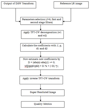 Here, the output of section 3.1 is considered as the first input image and second one is a reference LR image. Now, we will apply TFT-CW transform to the both images to get the multi resoluted coefficients with number of decomposition levels and first order, second order filters, then after we will calculate the new modified coefficients by applying the fusion rule with number of orientations and scales to get the HR image.
