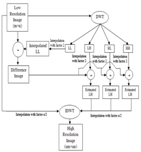 Fig2 shows the block diagram of existing DWT-RE method. First, the LR image is given as an input to the DWT to decompose it into four sub bands LL, LH, HL and HH, which known as approximation, horizontal, vertical and diagonal coefficients and last three sub bands are also called as detail coefficients. These sub bands size will be half of the LR image due to that the DWT has a decimation property. Hence we need to interpolate it to further operate it with the LR image.Now, the LL sub band will be interpolated to subtract from the original image i.e., LR image, after this operation a difference image will be obtained. This difference image will be added to the high frequency sub bands LH, HL and HH to improve the high frequency sub bands information. In order to perform addition for these sub bands, we need interpolation to increase the size of decimated sub bands because, the size of difference image equals to the LR image which is an original image. After performing this operation, the estimated or modified LH, HL and HH will be obtained. The after do the interpolation for LR image with a factor of , where the parameter α is a interpolation factor, and do the same for even estimated LH, HL and HH also. Finally, apply inverse DWT to these four sub bands to get the super resolute image i.e., HR image.